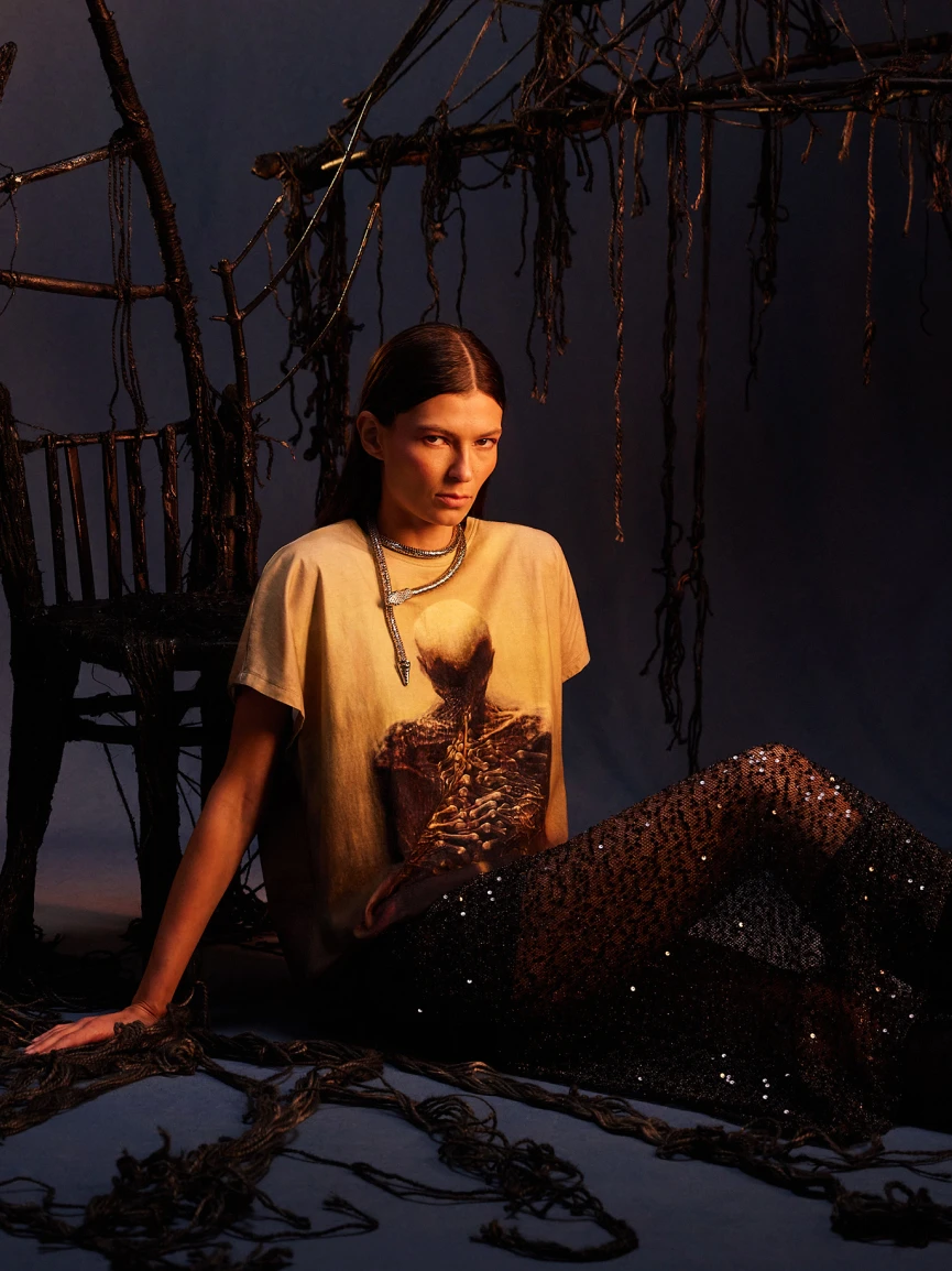 Cekinowa spódnica połączona z T-shirtem o surowej, mrocznej grafice wprowadza dekadę w bardziej alternatywny klimat. To połączenie budzi skojarzenia z estetyką „underground” lat 90., ale przefiltrowaną przez współczesną modę. To świetna propozycja, jeśli chcesz uzyskać wyrazisty look – idealny na wieczorne wyjście.
